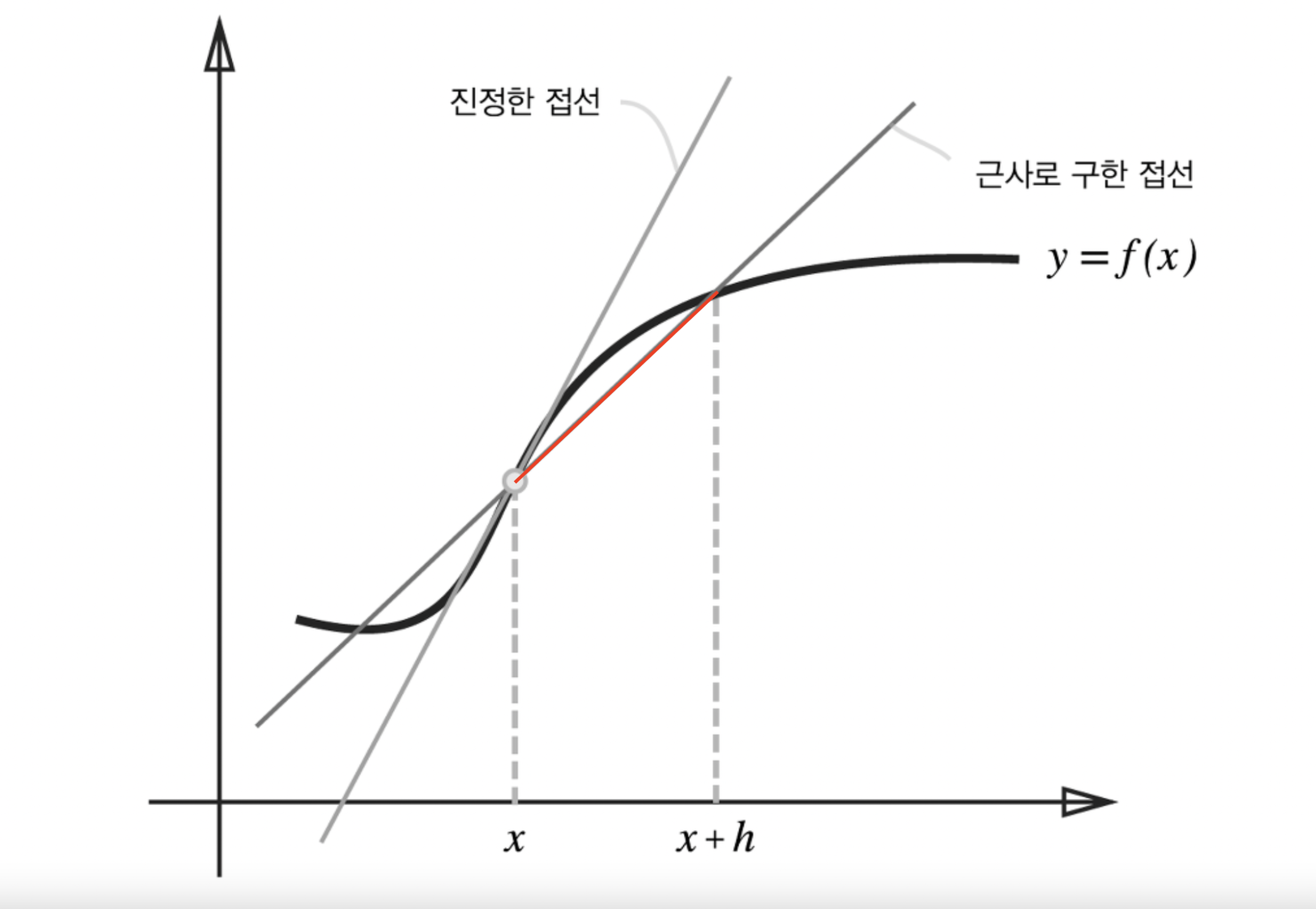 즉, 수치 미분은 우리가 구하고자 하는 x의 함수 f에 대한 접선의 기울기값/미분값을 근사치로 구하는 것이다.